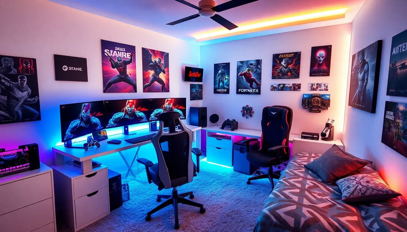 Bold themes reflect individual gaming interests. Gamers often opt for designs inspired by favorite games or characters. Popular choices include sci-fi aesthetics, fantasy landscapes, or retro styles. Color schemes contribute significantly to mood, with dark tones providing a focused atmosphere and brighter palettes creating vibrant energy. Accent walls featuring murals or decals allow for visual immersion. Lighting, like LED strips, complements these themes, enhancing the overall vibe of the room. Personal items, such as trophies or artwork, further create a unique space that resonates with the owner’s style.